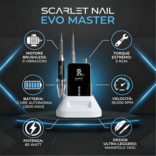 Per chi desidera esplorare le ultime frontiere dell’innovazione, la Evo Master rappresenta la nuova generazione di fresa per unghie professionale. Questo modello introduce nel mondo nails la tecnologia dei motori brushless (senza spazzole), che elimina completamente l’attrito meccanico interno. Il risultato è un salto tecnologico che si traduce in una silenziosità quasi assoluta e in un’assenza totale di vibrazioni percepibili sul manipolo.